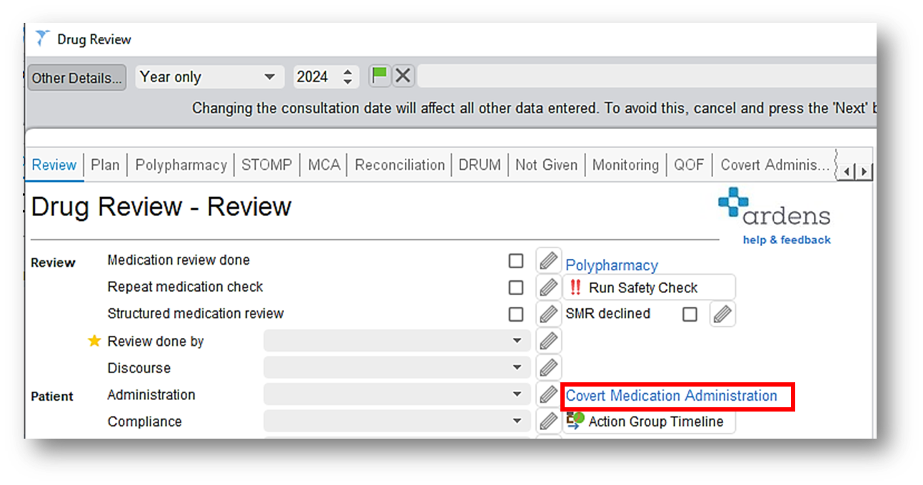 The 'Covert Medication Administration' tab can be found on the right hand side of the main drug review template.