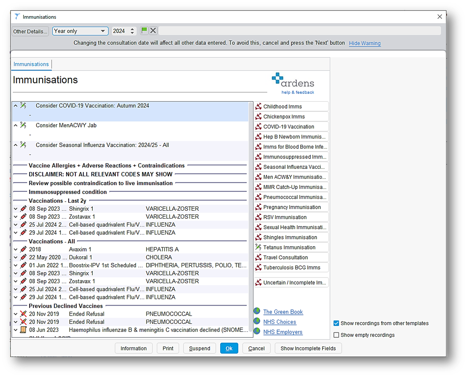 On the righthand side of the screen is a shortcut to all the useful vaccination templates that are available on Ardens. For more information on recording Vaccinations on SystmOne, please see our recording vaccinations support article.