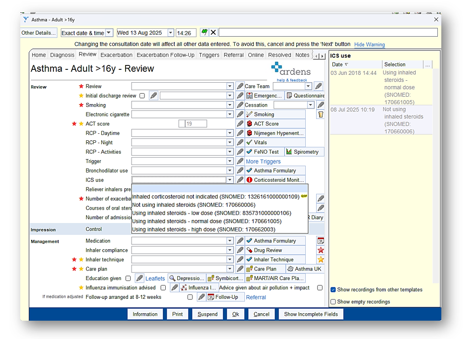 Patients can be removed from the search by either coding that the inhaled steroid has stopped or the potency reduced, or that a steroid card has been given or not indicated.