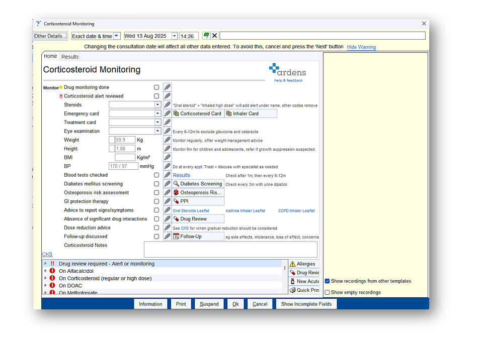 This template can be accessed from the Drug Monitoring template, Auto-Consultation, any template containing steroids, F12 favourites or the ‘Search features’ box in the bottom left hand corner of SystmOne.