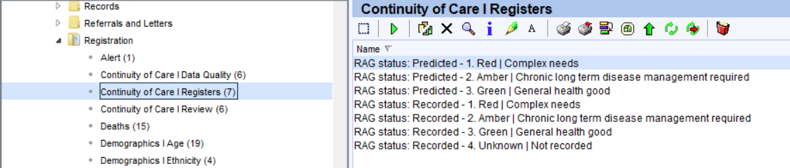 To support RAG status coding during patient segmentation, the Continuity of Care Template is available. Access the template via the Run Template option in an open consultation and search for Continuity of Care.