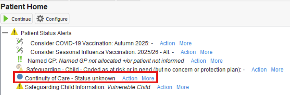Alerts for a patients RAG status can be viewed either in the patients demographic box, or on the patients home screen. Clicking on the icon in the demographic box, or clicking 'Action' next to the alert on the patient home screen will launch the Continuity of Care template.