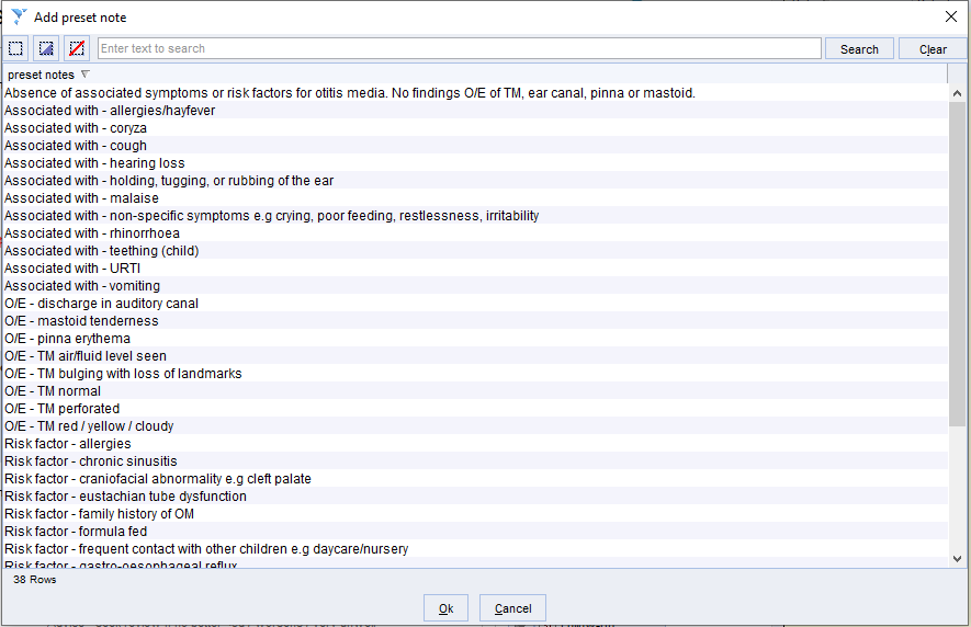 Both the findings and complications/risks free text boxes have presets available alongside to save a bit of typing.