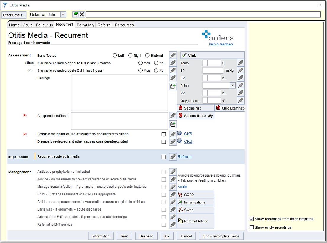 Assessment allows you to record which ear(s) are affected, your findings and any complications/risks.