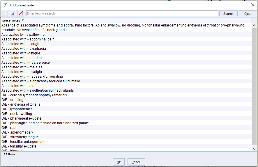 Both the findings and complications/risk factors free text boxes have presets available alongside to save a bit of typing.