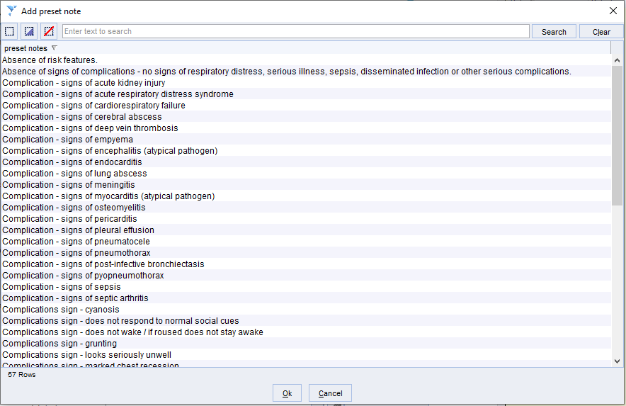 The History, Examination and Complications/Risks free text boxes have presets available alongside to save a bit of typing and list red flags.