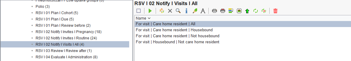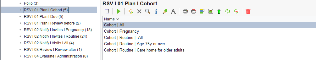 Here you will see the different cohorts for the RSV vaccination. The cohort reports do not take into consideration whether a patient has had the vaccination or declined it, therefore patients will not fall off these reports once they have had the vaccination.