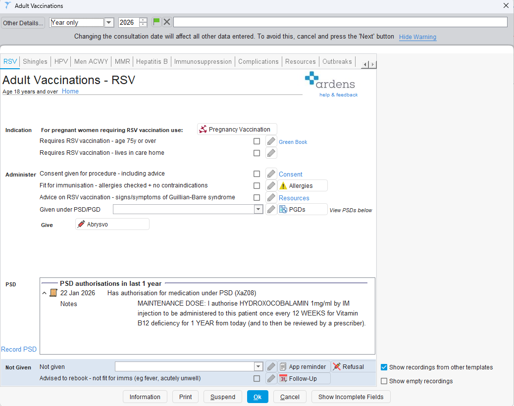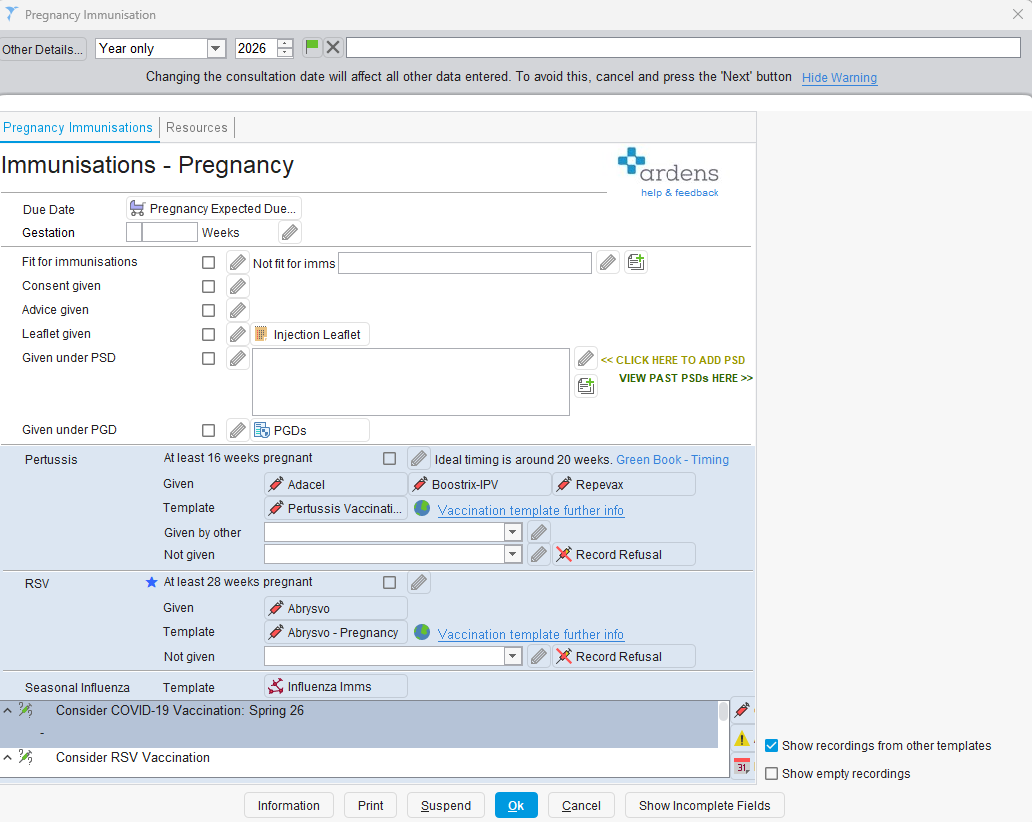 - For 1st Invitation | Pregnancy - Includes all pregnant patients. Clinician can check how many weeks pregnant the patient is to determine eligibility and invite appropriately. Where appropriate, vaccinations may be administered during routine midwife appointments. The Ardens "Pregnancy Immunisation" template can be used to record the RSV vaccination.