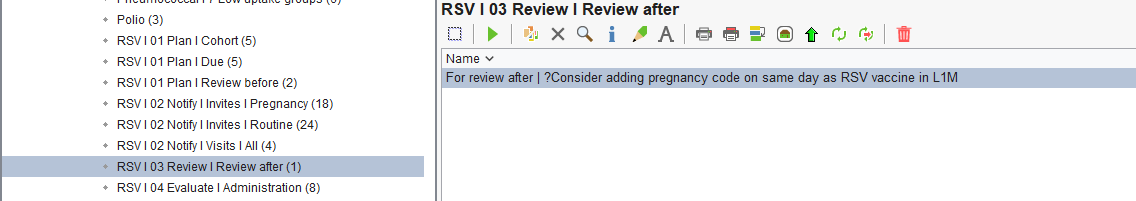 - For review after | ?Consider adding pregnancy code on the same day as RSV vaccination last month + pregnant at time of vaccine - Identifies pregnant patient who have received the RSV vaccination in the last calendar month but did not have the 'Patient currently pregnant (77386006)' recorded on the same day as the vaccination. Practices should review these patients and decide whether it is appropriate to backdate the pregnancy code to match the vaccination date.