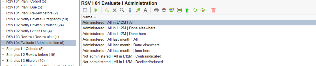 Navigate to Reporting > Clinical Reporting > Arden's Ltd > Vaccinations > RSV | 04 Evaluate | Administration