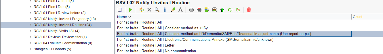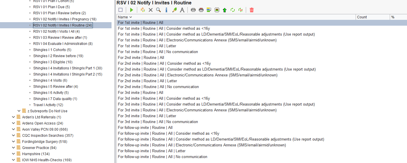 These reports will provide you with a list of eligible patients who can be sent an invite to arrange vaccination. Invite reports are split between Pregnancy and Routine and then grouped into the following: