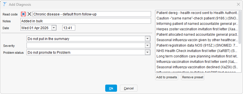 The Chronic disease – default from follow-up (170559008) code can be added in bulk against a list of patients on a report, or individually in a patient record by using the LTC Review template.