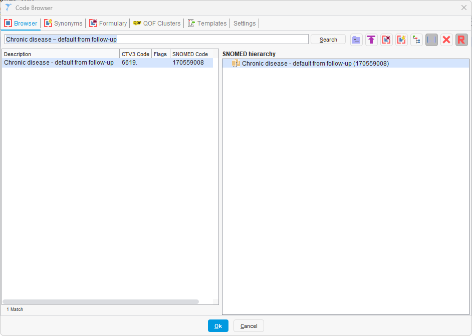 icon next to 'Read Code'. - In the code browser, search for and select Chronic disease – default from follow-up
