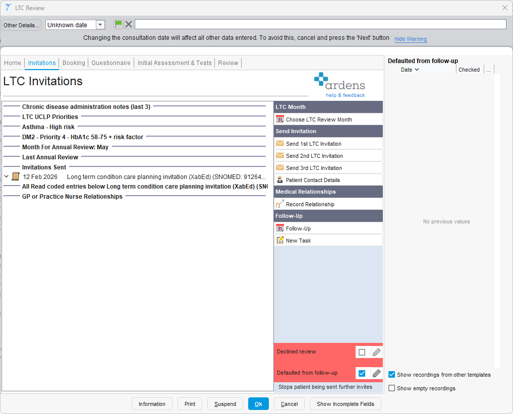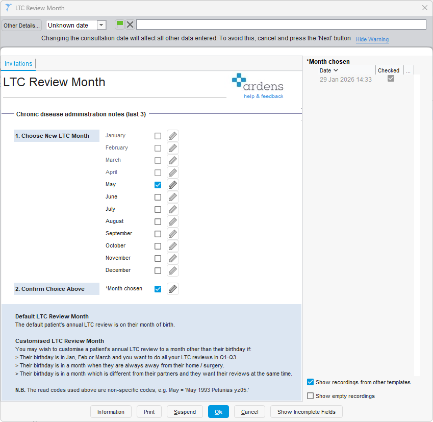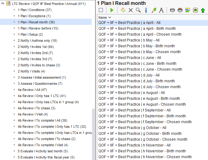 By default, patients are invited for their LTC review in their month of birth. However, it is possible to move a patient to a different recall month where appropriate.