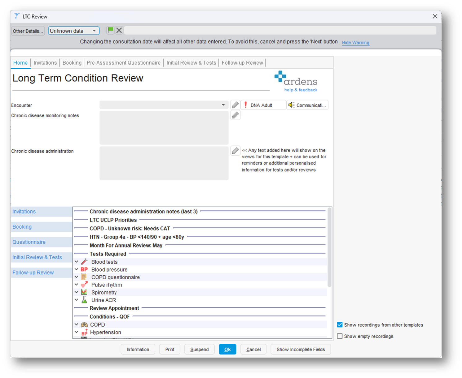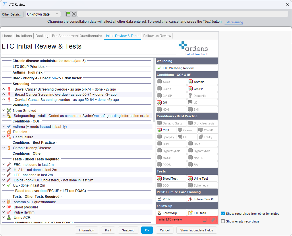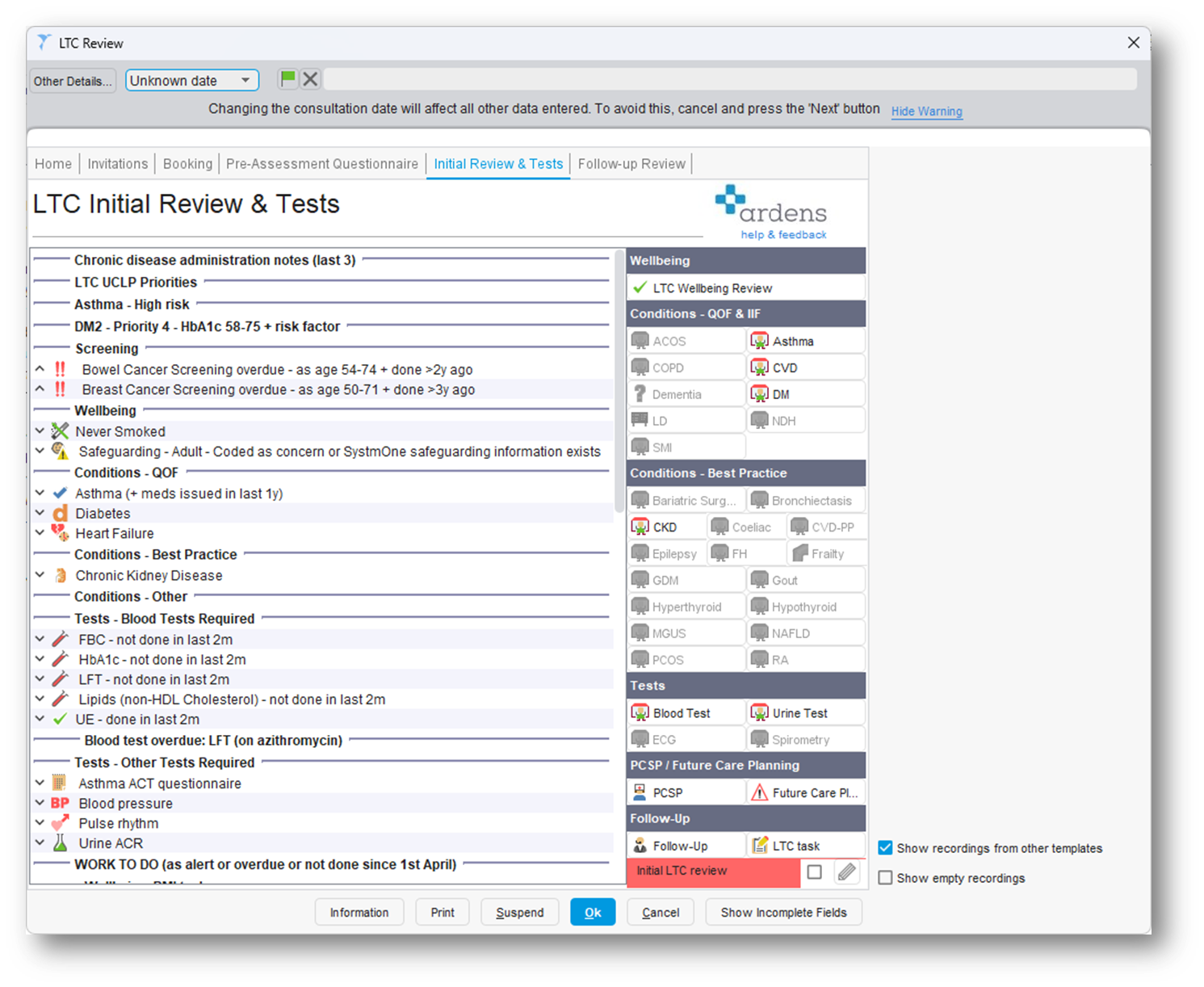 The Long Term Condition template works alongside the LTC Review Invite process to make annual reviews performed in a patient streamlined. The template clearly lists the patients conditions, bloods that need to be taken dependent on their condition, and any outstanding work that needs to be done. The template is also dynamic on a patient and only highlights the templates that are relevant for each patient. It also has a tick box to record once the Initial Review and Follow-Up review have been completed to ensure the Invite process works smoothly.