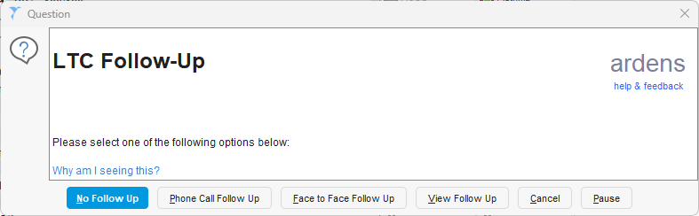 The same applies for the other follow-up functions within this pop up depending on whether or not the patient requires a follow up, choose the appropriate option.