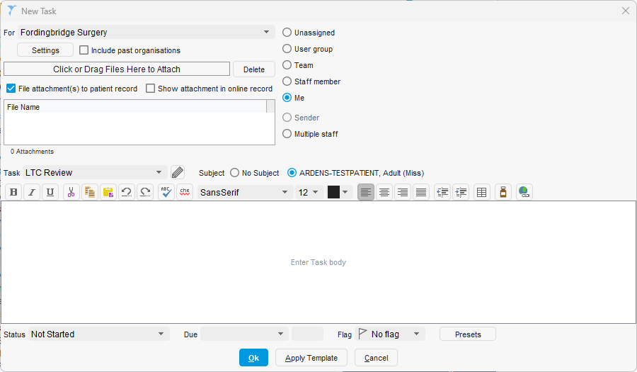 The text in this box can be copied by highlighting the text with the mouse and copying (Ctrl + C), then click Send Email or SMS. This will launch the SystmOne Communications Annexe where you can paste the copied message and Send to the patient. Or you could choose Send Task to message another member of staff to advise the patient.